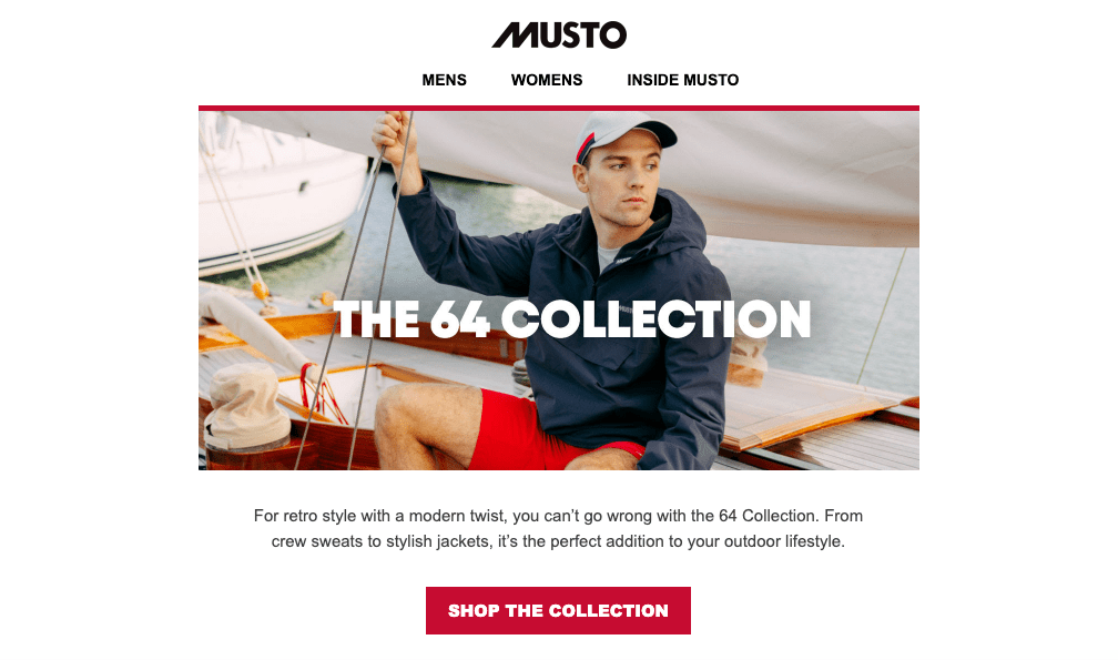 *Musto email campaigns range from product segments to seasonal guides and brand collaborations (like the Musto & Land Rover image above).